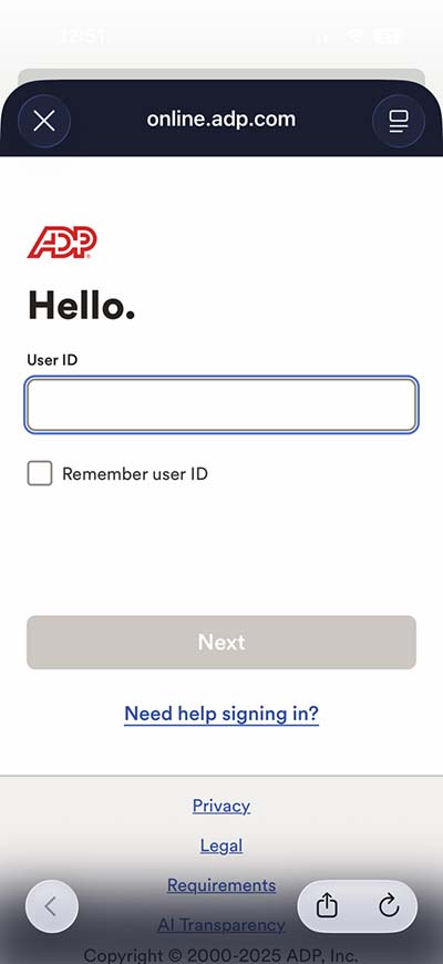 1. Login to ADP (https://workforcenow.adp.com/) using your user ID and password.