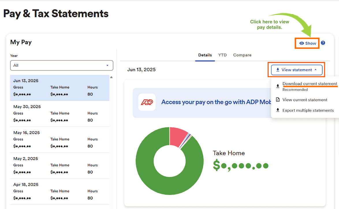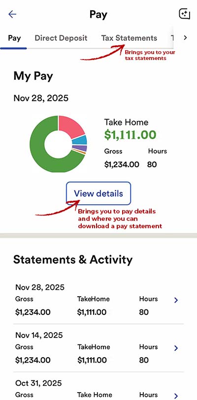 - Select VIEW DETAILS to see deductions and download pay statements. You can also select from a list of older pay periods at the bottom.