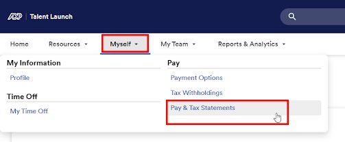 2. Click on MYSELF from the menu options. Then click on PAY & TAX STATEMENTS to find your paystubs and W2s.