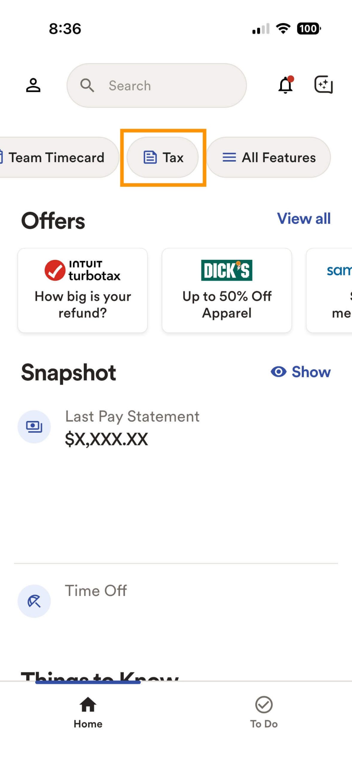 6. From the Home screen, swipe the top menu items to find the TAX option and click it.