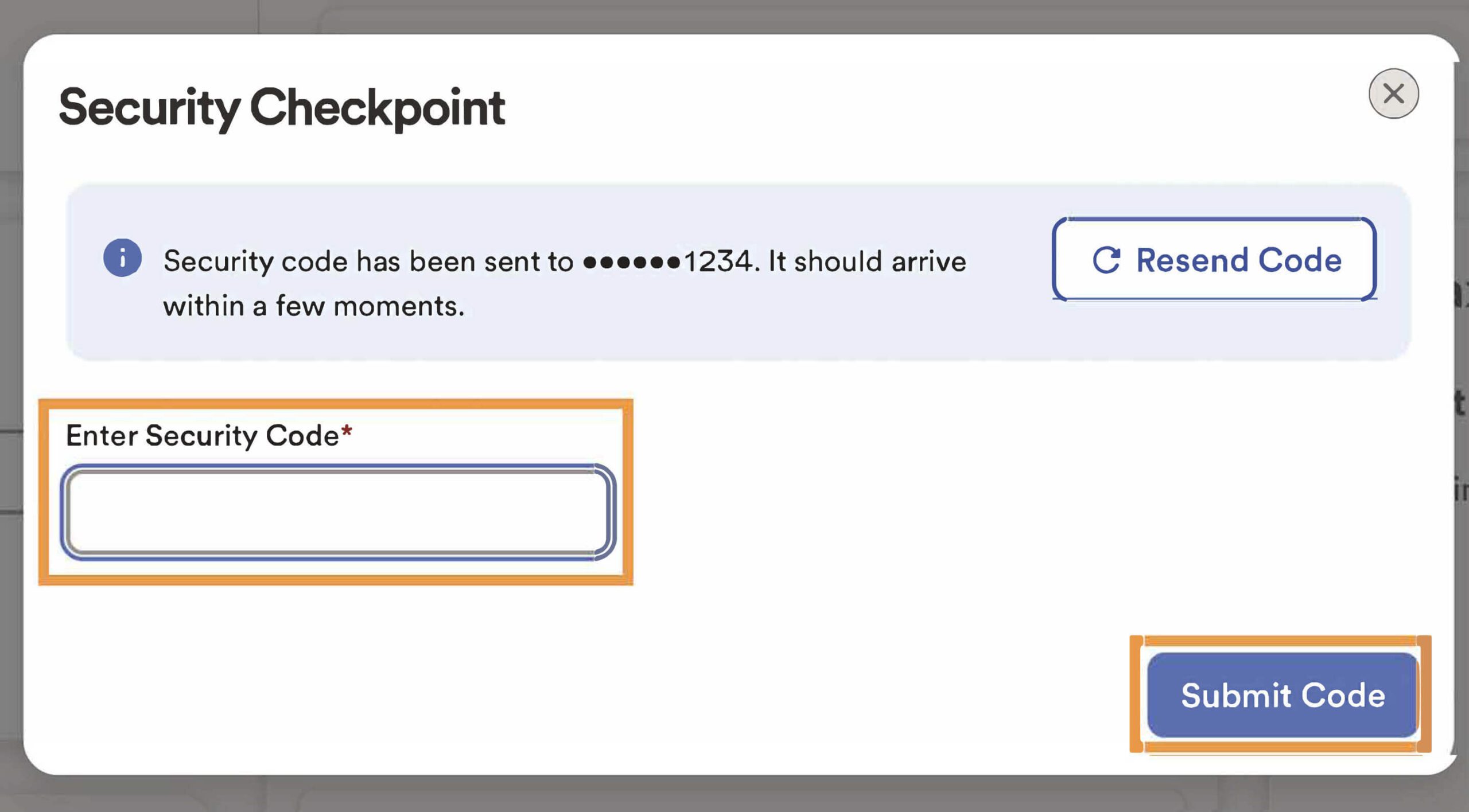 8. ENTER THE SECURITY CODE number you were sent and click SUBMIT CODE.